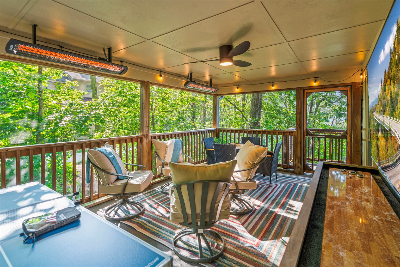▶ Covered & screened dining and game porch (2nd outdoor living area) with dining for 4, plus 4 swivel conversation chairs, shuffleboard, mid-sized ping-pong, 75" Smart TV, and two commercial grade heaters